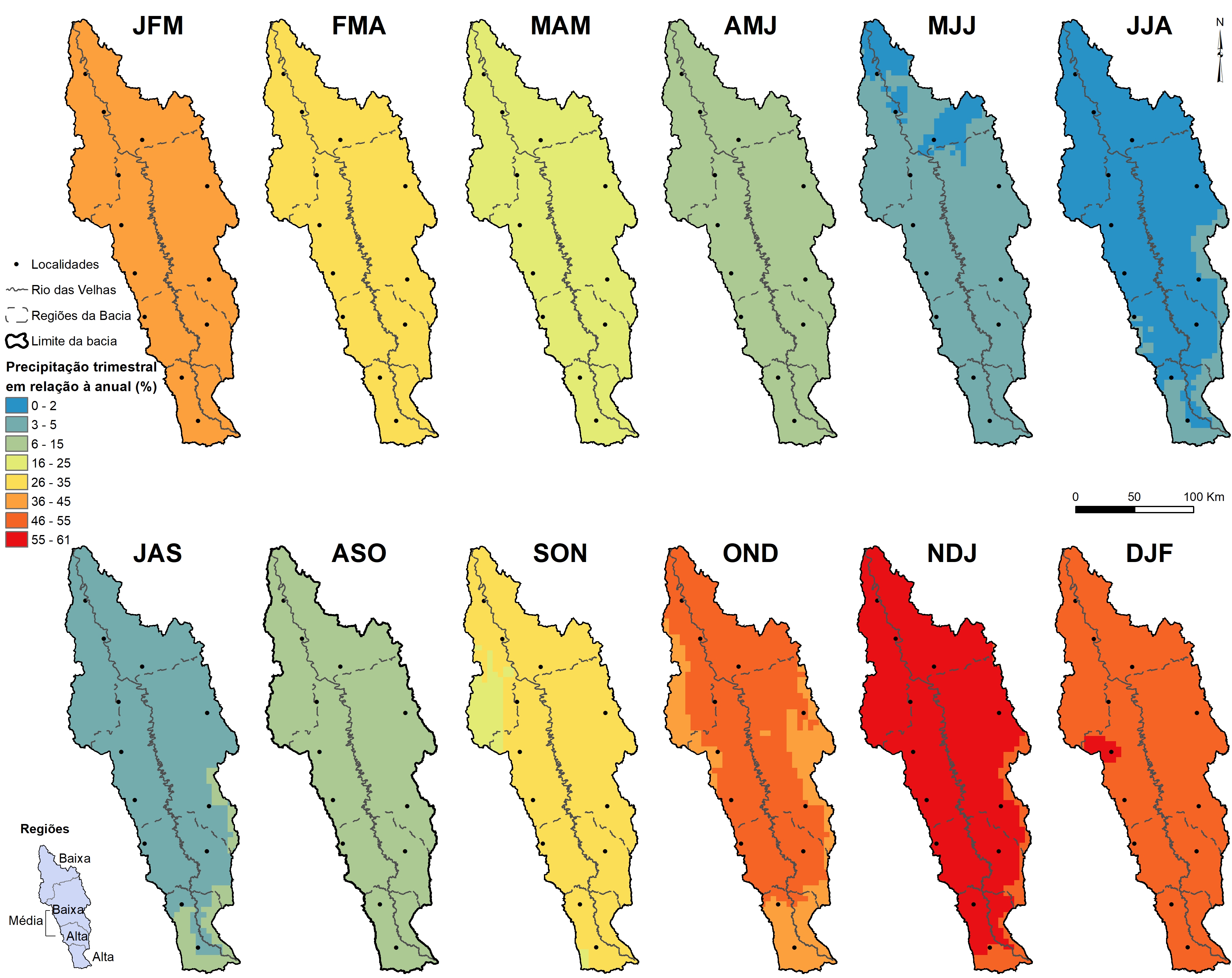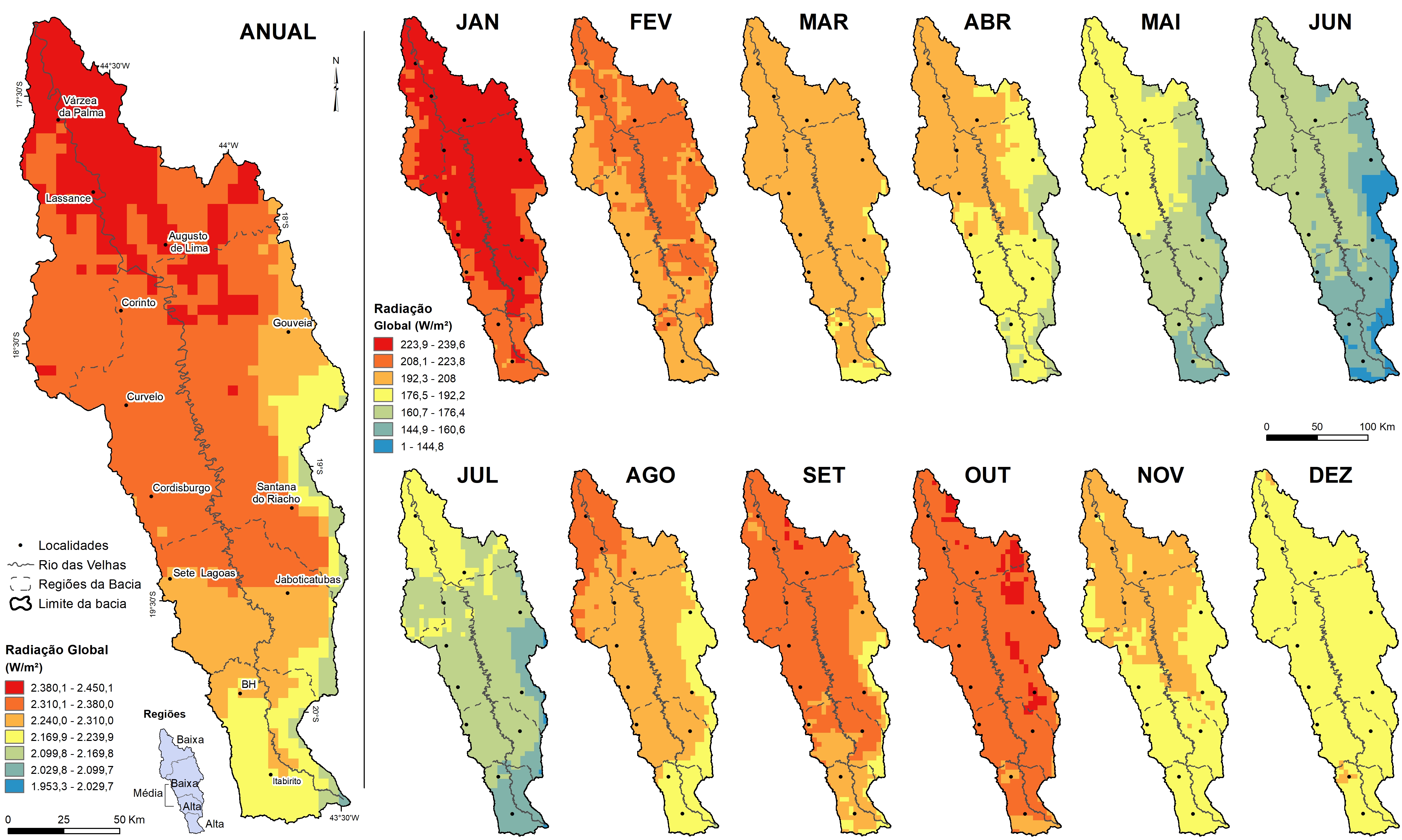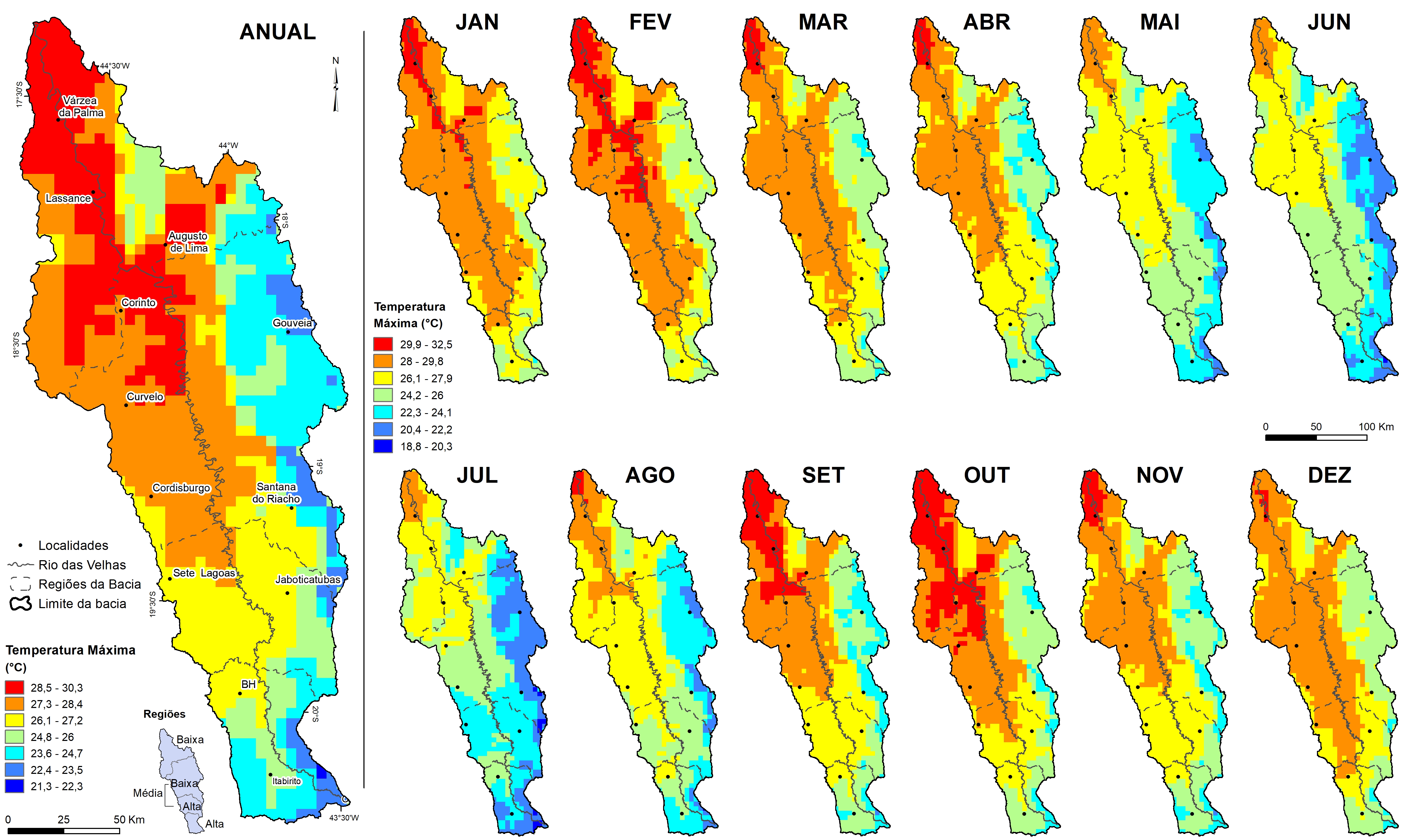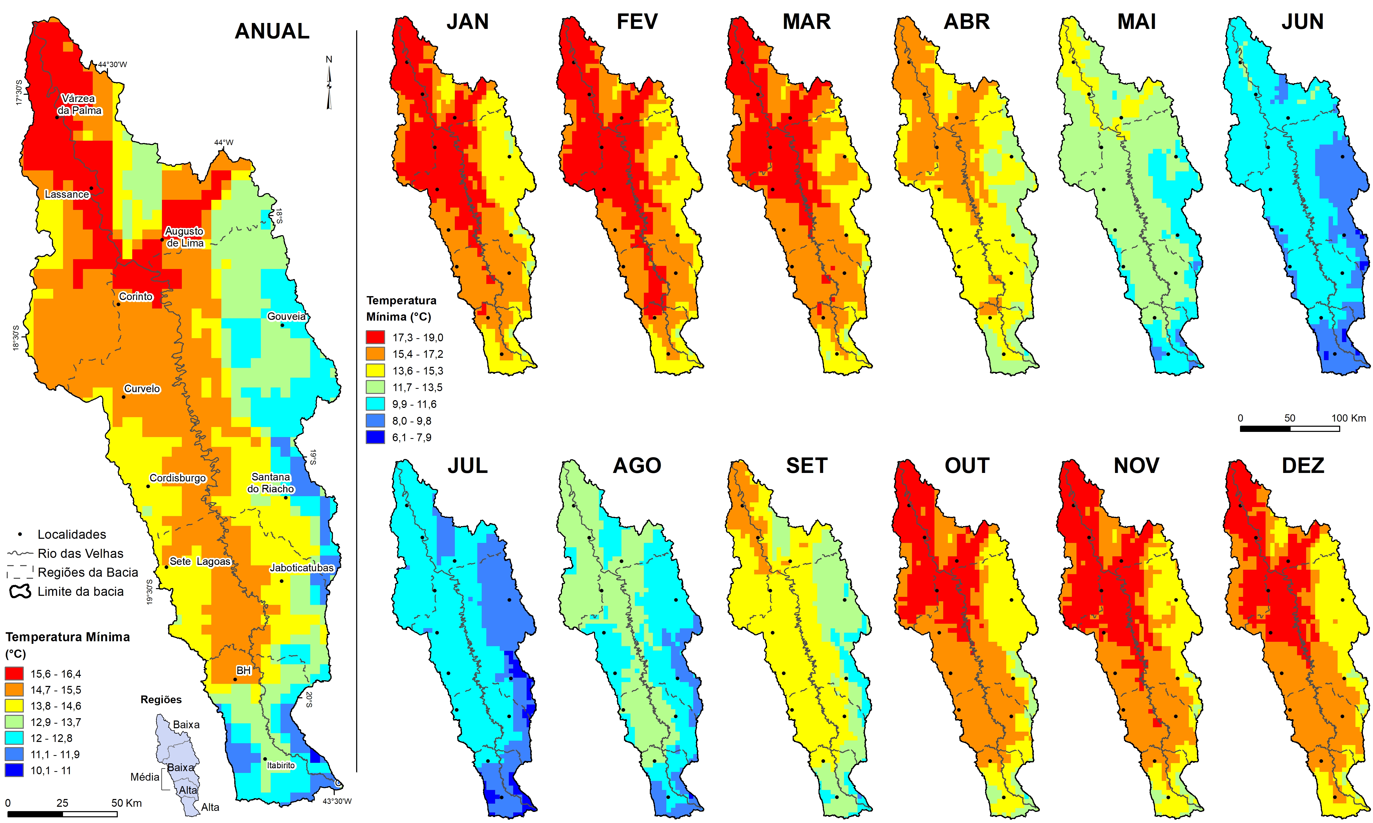 A seguir, vamos caracterizar o clima na bacia hidrográfica do rio das Velhas utilizando dados meteorológicos médios da bacia do período de 1991-2019.