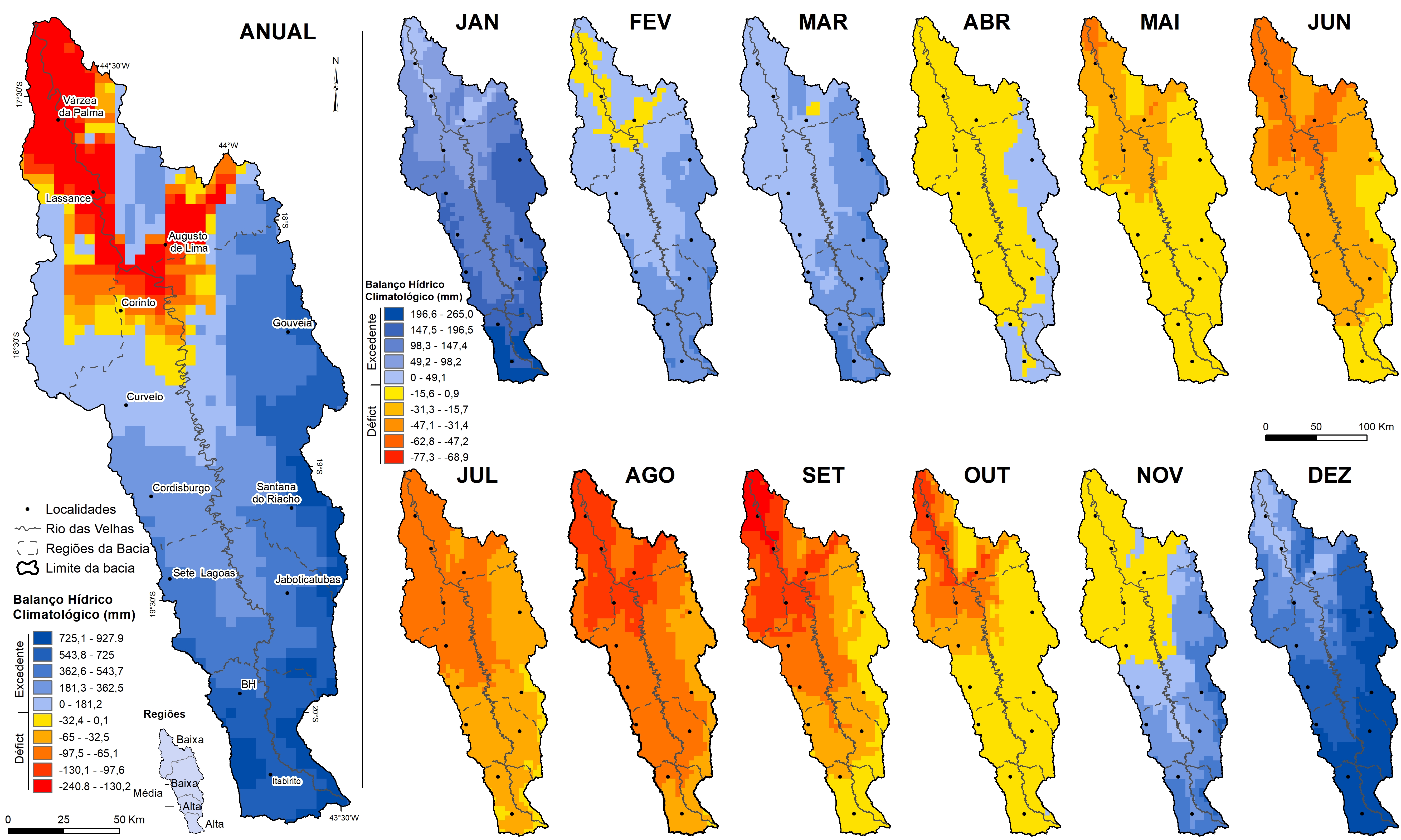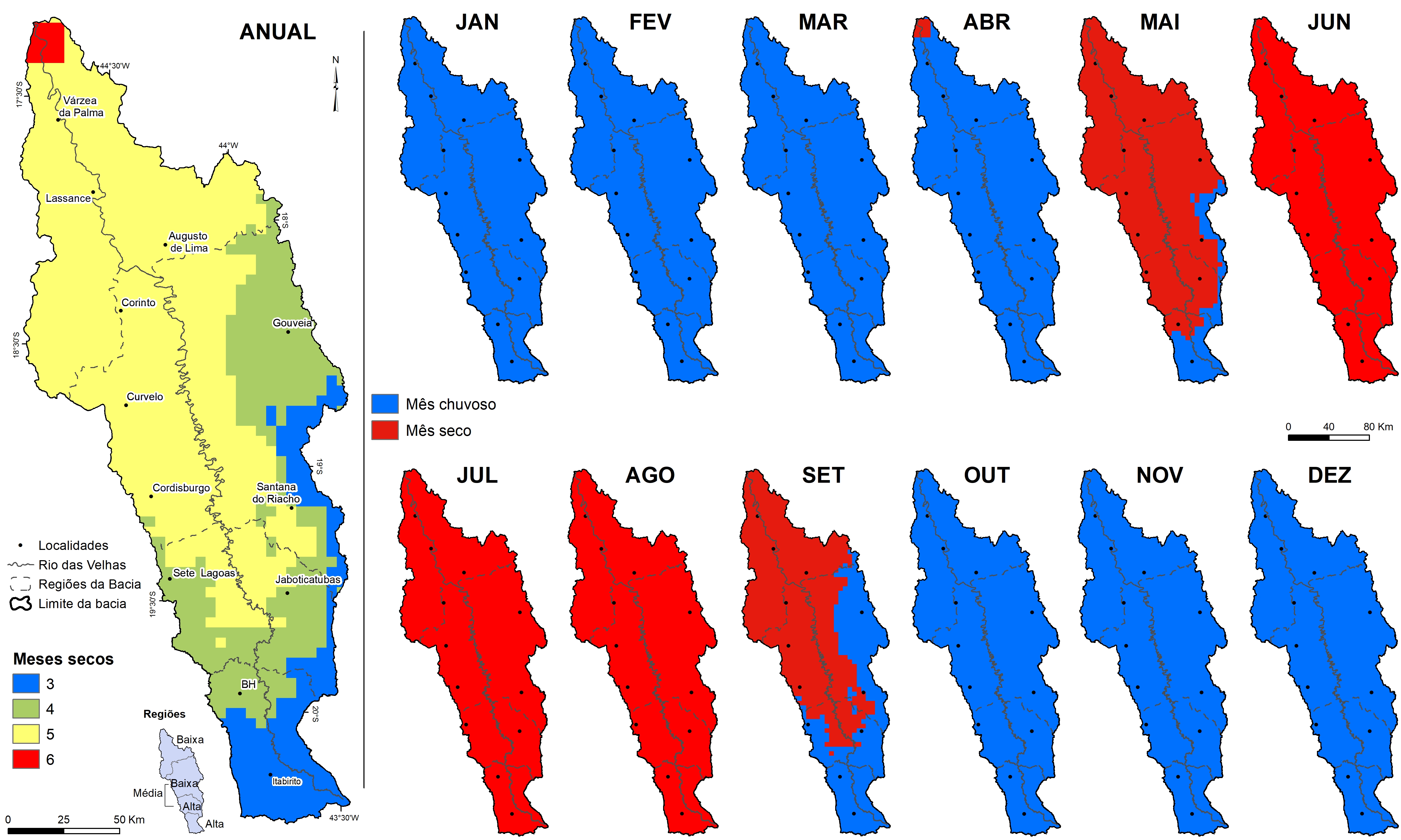 Já as áreas próximas da foz do rio das Velhas recebem menor precipitação anual, tanto pela falta de um relevo elevado que poderia gerar o efeito orográfico, quanto pela localização latitudinal, em uma posição na qual os sistemas atmosféricos úmidos chegam com menor frequência, e quando chegam já perderam parte de sua umidade nas áreas próximas à alta bacia. Fica claro, porém, na imagem acima, que a bacia tem precipitação reduzida em seu território como um todo nos meses de maio a setembro, quando atua sobre o continente um sistema atmosférico muito estável, que inibe a precipitação chamado Anticiclone Subtropical do Atlântico Sul. Esse sistema é o maior responsável pelo estabelecimento de meses secos na bacia que vão de maio e setembro, e também pelo défict hídrico que acomete a bacia como um todo durante seis meses do ano (de maio a outubro).